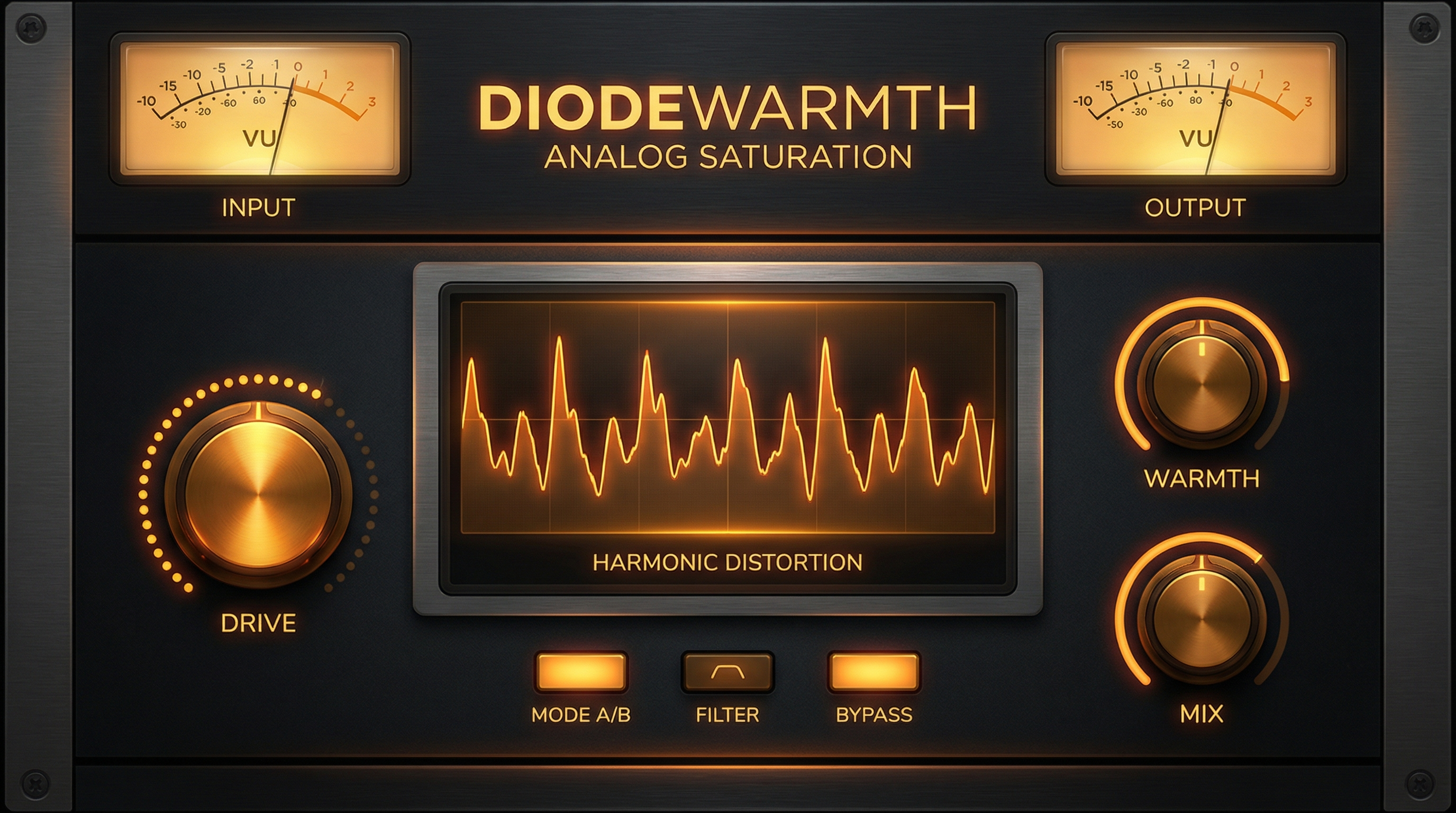 Add life and warmth to any signal. DIODEWARMTH models the harmonic behavior of analog diode circuits, delivering rich saturation from subtle warmth to aggressive overdrive — with a real-time transfer curve display.